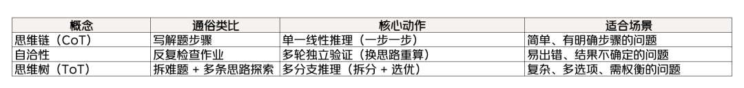 思维树:让 AI“会拆难题、选思路”;都是为了让 AI 的回答更靠谱,只是简单问题用思维链,易出错问题加自洽性,复杂问题用思维树~