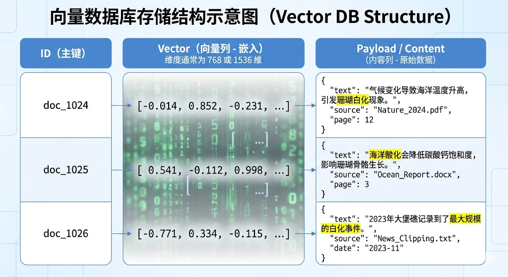 这些向量会被存储在专门的向量数据库(如Elasticsearch, FAISS, Pinecone)中,建立高效索引,以便后续进行毫秒级的相似性搜索。