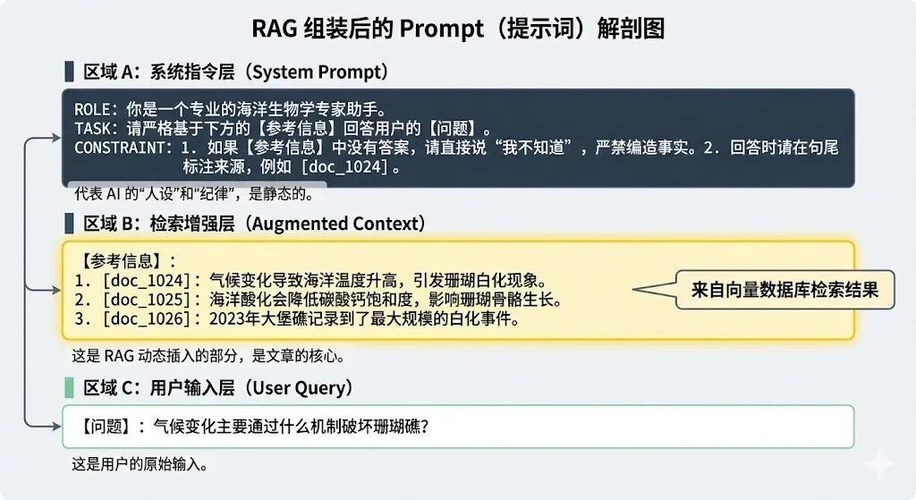 这是 RAG 的关键环节。系统拿到 Top-K 的文档后,需要将其与用户的原始查询进行融合组装成一个更大的Prompt: