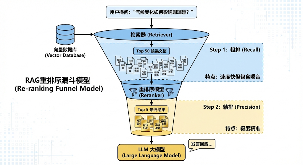 系统会根据相关性得分进行排名(Re-ranking),通常只保留Top-K(例如前 5-10 个)最相关的文档块。这确保了输入给大模型的信息是精华中的精华。这一步虽然增加了少许耗时,但能极大提升最终回答的准确率。
