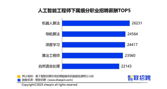 薪资方面更是香到离谱,人工智能工程师平均招聘月薪已经冲到 21319 元,成了职业里的薪资天花板。其中细分岗位里,机器人算法工程师月薪最高,能到 26231 元,导航算法和深度学习工程师也紧随其后,分别是 24564 元和 24417 元,自然语言处理、算法工程师的月薪也都在 22000 元以上。