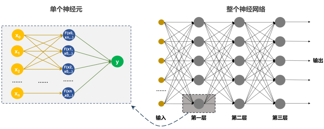 模型中有多层神经网络,每层神经网络有很多神经元,如同多层嵌套函数,而每个神经元,每个嵌套函数,可以理解为一个函数y=F(x),它可以通过调整参数来控制输出。