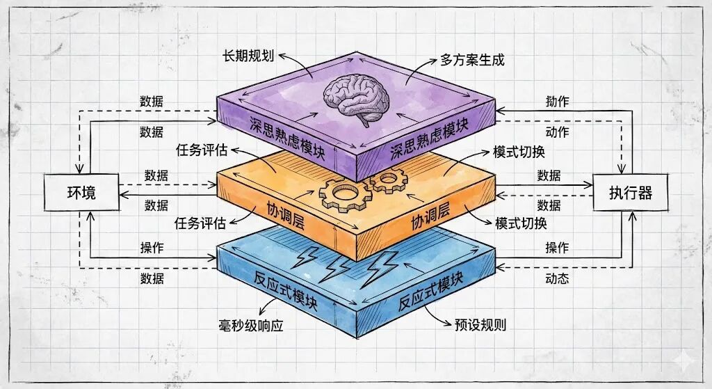 •中层(协调层):架构的“中枢神经”,核心功能是任务分类、优先级评估与模式调度。通过LLM或规则引擎分析输入特征(如查询复杂度、时效性、资源需求),判定任务类型(紧急型/信息型/分析型),并选择对应处理模式。协调层还需管理系统资源分配,避免深思熟虑模块占用过多资源导致反应式任务阻塞,常用策略包括资源配额、任务队列排序等。