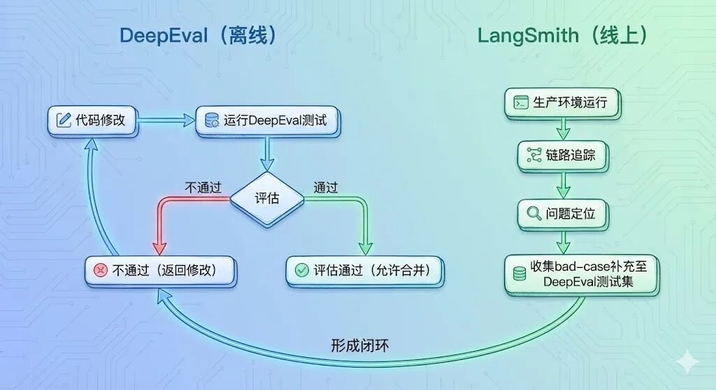 DeepEval与LangSmith的协同分工明确,形成全生命周期评估闭环: