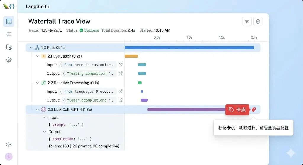 •调试与追踪:实时记录Agent的决策链路,包括LLM调用、工具使用、状态转换、输入输出等细节。支持瀑布式可视化展示各节点耗时,快速定位“卡点”(如LLM推理延迟、工具调用失败)。例如投顾AI的深思熟虑流程中,可通过追踪发现数据收集环节耗时过长,优化接口调用策略。