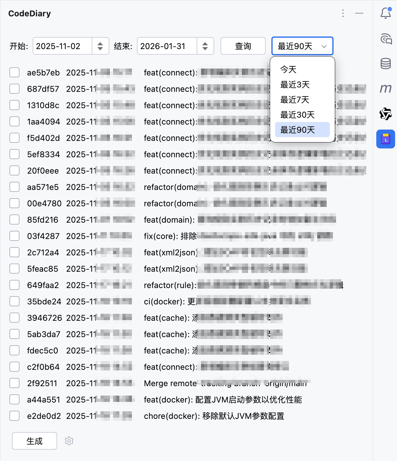 CodeDiary 提供了灵活的时间范围选择机制,让你能够精确控制要查询的提交记录范围。