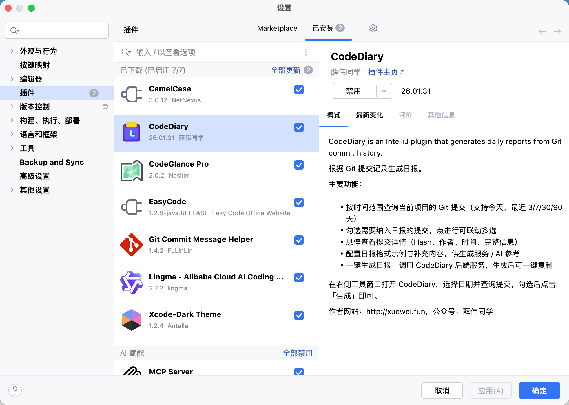 Settings/Preferences→Plugins - 搜索 “CodeDiary”,作者认准 “薛伟同学”。