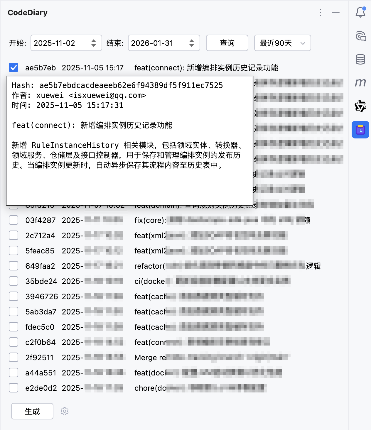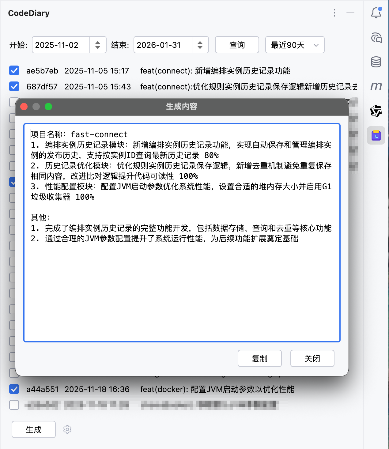 这是 CodeDiary 的核心功能——将代码提交转化为自然语言工作报告。支持生成任意时间范围的工作报告,从单日的日报到跨月的项目总结,只需选择对应的时间范围即可,生成结果展示在弹窗中,支持一键复制到剪贴板,粘贴即用。