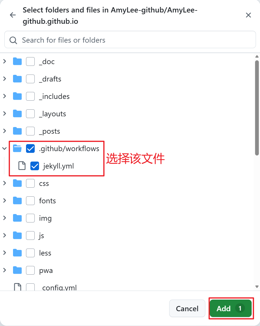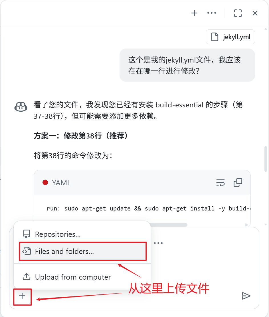 我这里,根据它给出的解释,加上我自己的理解与分析,发现是jekyll.yml文件中的问题,因此,我从左下方的+按钮,把我仓库中的jekyll.yml文件直接发送给了它,让它告诉我具体在哪一行进行修改。