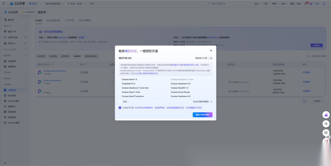 - 开通“嵌入模型(Embedding Model)”。