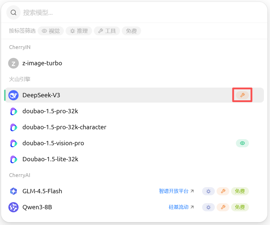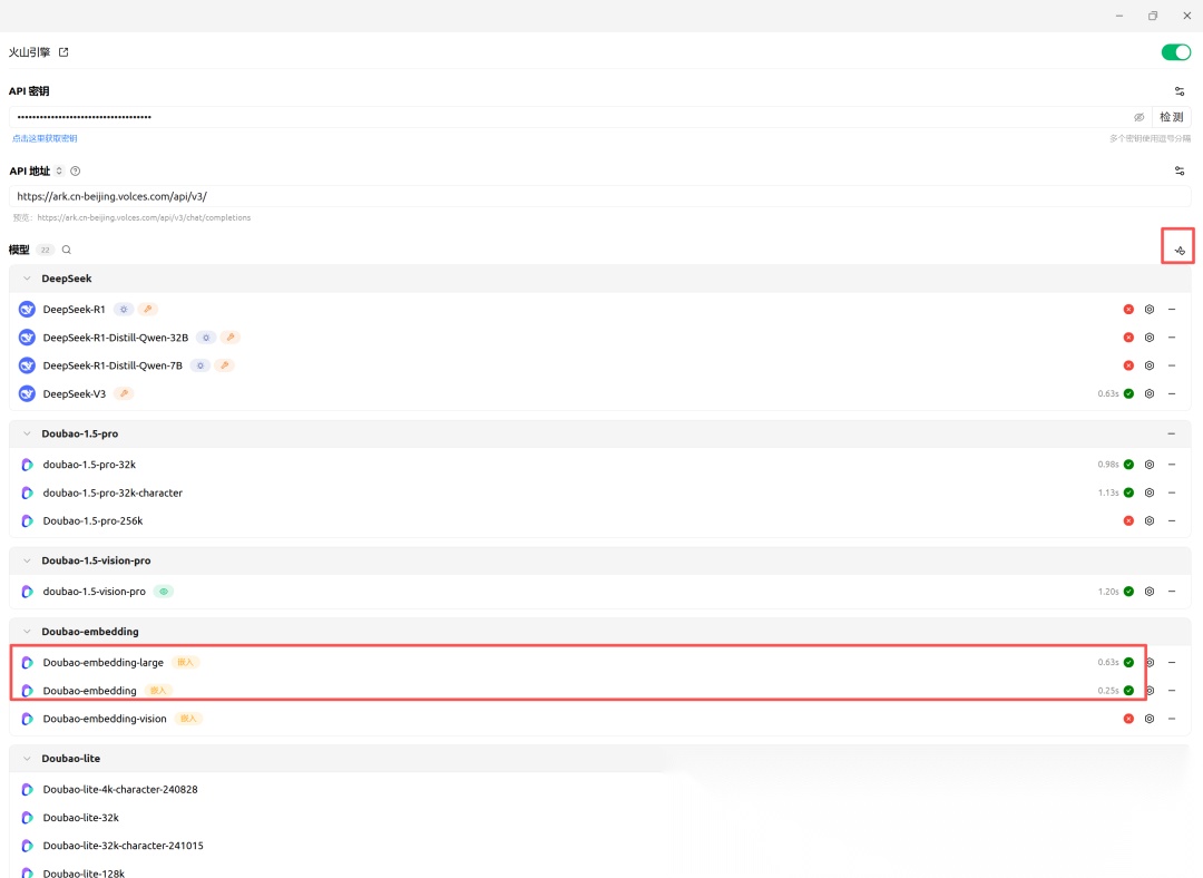 - 在Cherry-studio测试一下你的模型是否配置成功。如果不能访问可以前去火山引擎官网检查是否开启了这个模型服务。在模型右侧把不可用的模型删除,只展示可用模型。