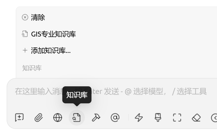 - 在输入框下方的工具栏中,点击“知识库”,选择你刚才创建的库。
