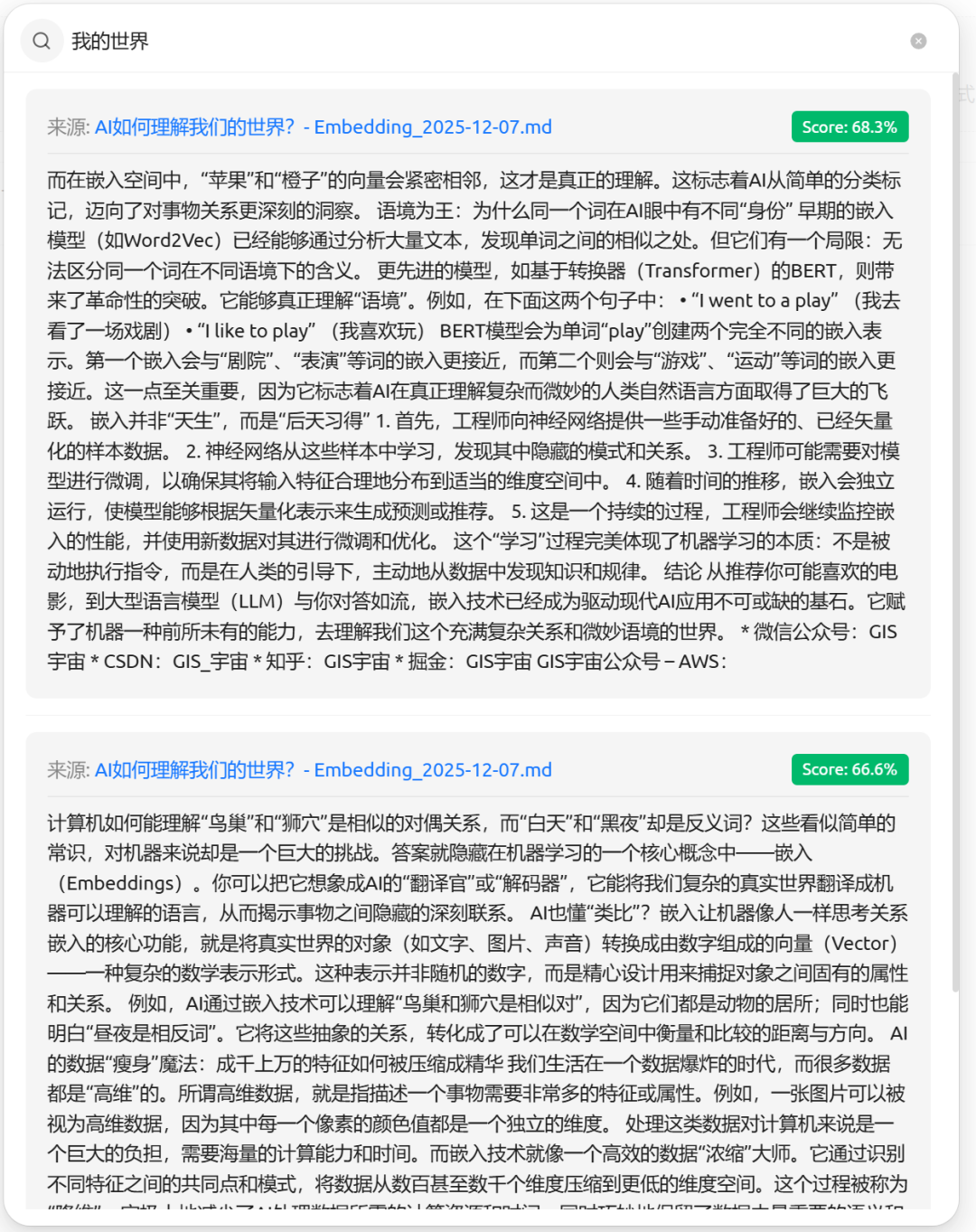 - 系统会展示检索结果以及匹配分数。 这个分数其实就是向量之间的“距离”。距离越近(分数越高),说明 AI 认为这段内容与你的问题越相关。