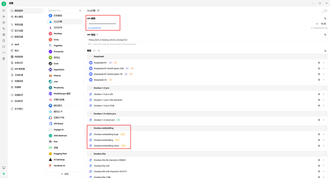 - 选择嵌入模型:选择Doubao-embeding模型,嵌入维度点击右侧刷新按钮自动设置即可。