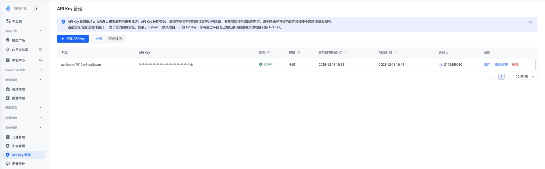 - 这里推荐火山引擎的API,有50w的免费额度。点击申请API key。