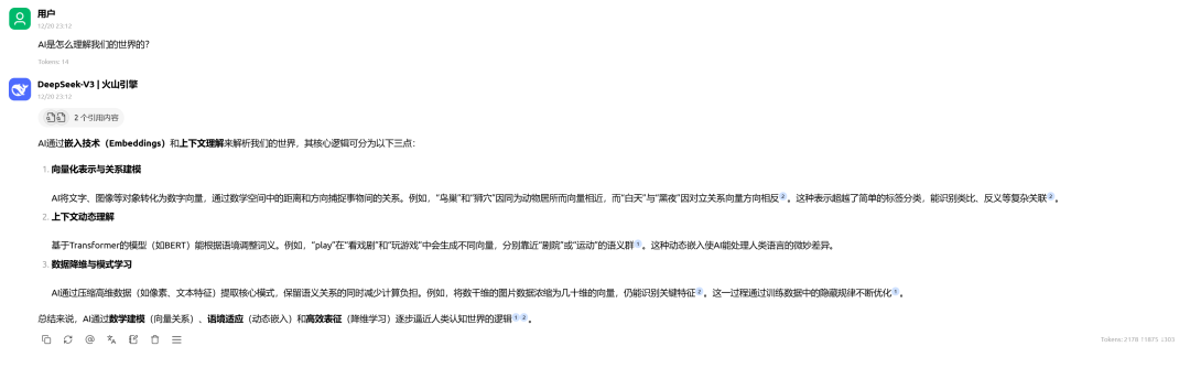 比如你可以问:“AI是怎么理解我们的世界的?” 此时,模型不会胡编乱造,而是会先通过 Embedding 检索知识库中的相关片段,结合上下文(Context),生成精准的回答。Cherry Studio 甚至会在答案下方附上数据来源,方便你核对原文。