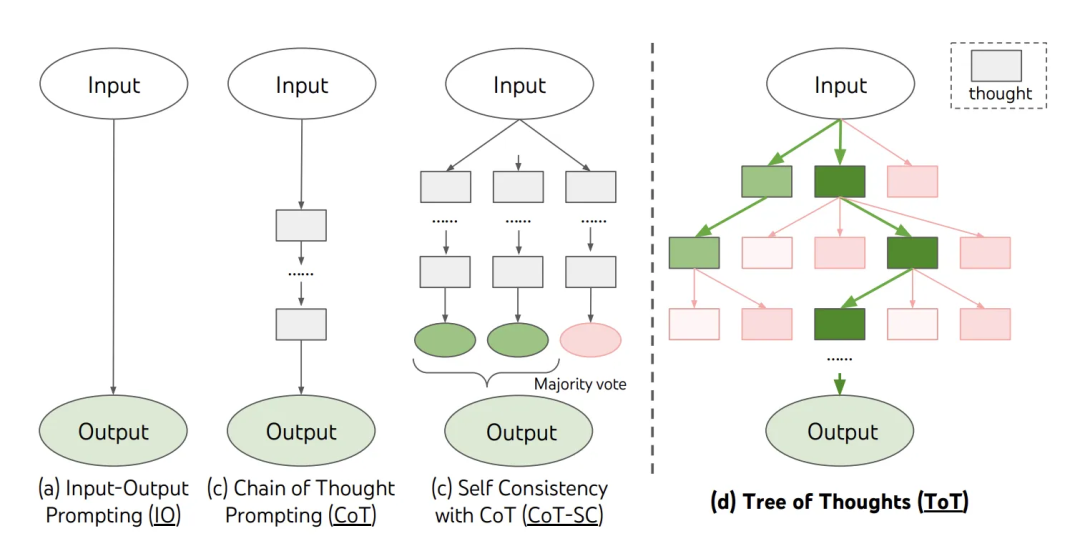 思维树 (Tree Of Thoughts),CoT通常只有一条解决问题的路径,ToT等于是CoT的一个拓展,把一条reasoning路径拓展至多条reasong paths,这样模型可以综合多条reasoning path的结果得到最终的结论。