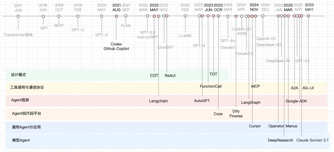本文系统梳理了2017年以来大语言模型的发展历程,从Transformer架构到2025年的高性价比推理模型。详细介绍了RAG知识库应用的三阶段演进及Agent应用的设计模式(COT、TOT、ReAct等)、多智能体系统和通用Agent案例。文章还探讨了推理模型发展趋势,并提供了构建Agent的建议与框架选择指南,为开发者提供全面的大模型技术参考。