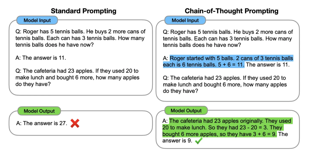 思维链,Chain-of-Thought Prompting ,22年5月,谷歌发表论文Chain-of-Thought Prompting Elicits Reasoning in Large Language Models,提出方法在输入提示(Prompt)中加入人工编写的推理步骤示例,引导模型生成类似的分步思考过程,最终得出答案。通过在提示词中显式要求模型生成推理链(如“因为…所以…”),提升模型在需要逻辑、数学或符号推理的任务的准确率。通过将“黑箱”输出转化为可解释的推理过程,COT不仅提升了模型性能,也为后续的AI可解释性研究和复杂任务处理奠定了基础。