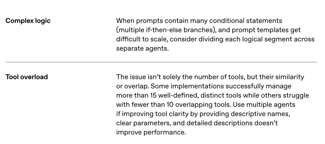 - 对于许多复杂的工作流程,将提示和工具拆分到多个智能体中可以提高性能和可扩展性。当您的智能体无法遵循复杂的指令或持续选择错误的工具时,可能需要进一步拆分系统,引入更多独立的智能体。
