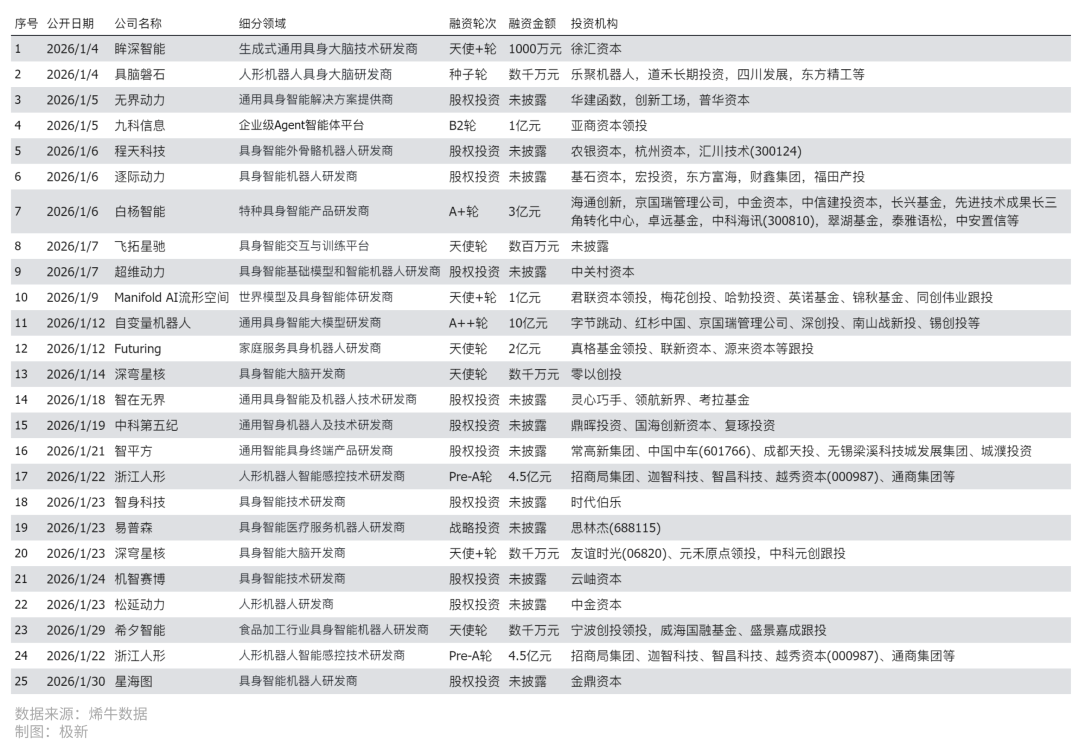 图三:2026年1月我国人工智能-具身智能领域投融资事件统计(数据来源:烯牛数据)