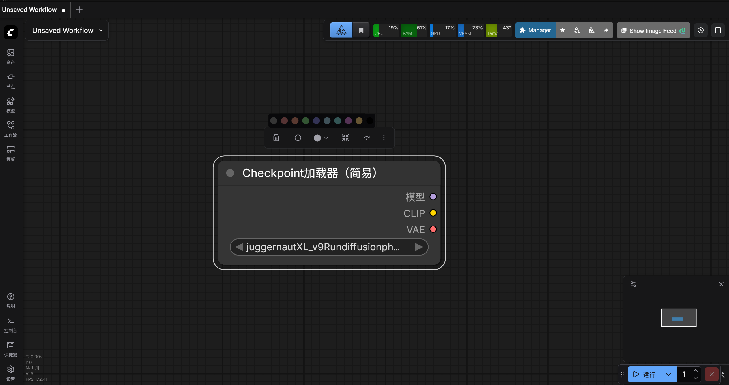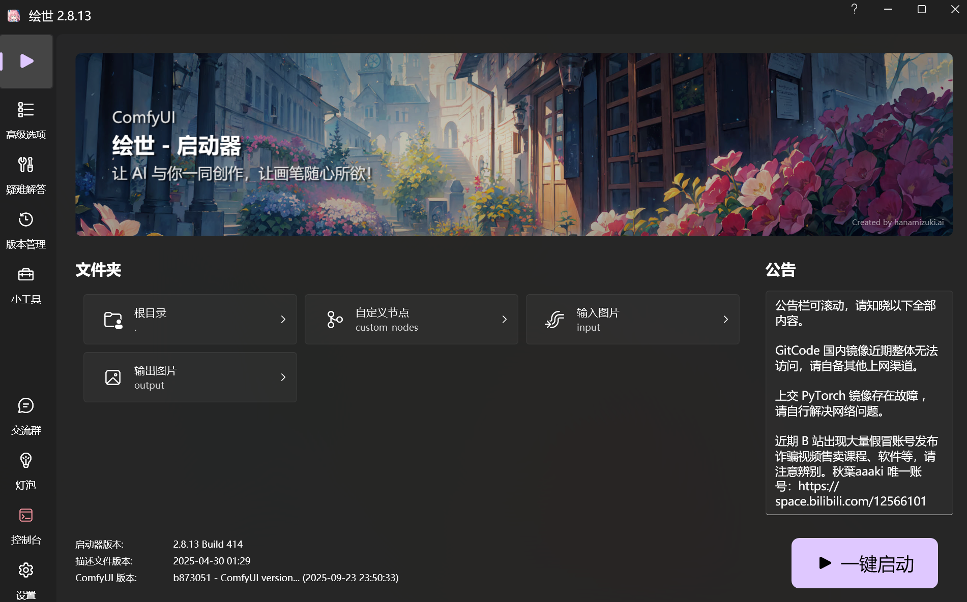 这里以线下安装秋叶整合包为例,一键启动进入ComfyUI界面之后,对ComfyUI基本使用操作进行介绍: