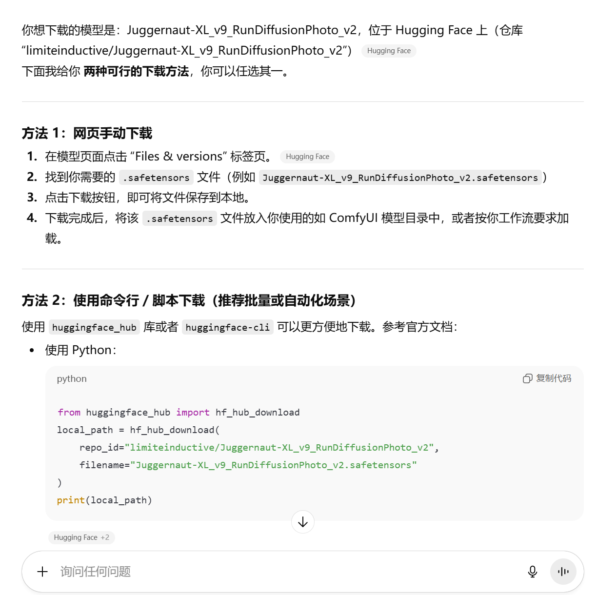 AI会告诉你缺少哪些模型或插件,附上下载链接让你下载,AI还会告诉你下载的模型或插件放到哪个目录下。