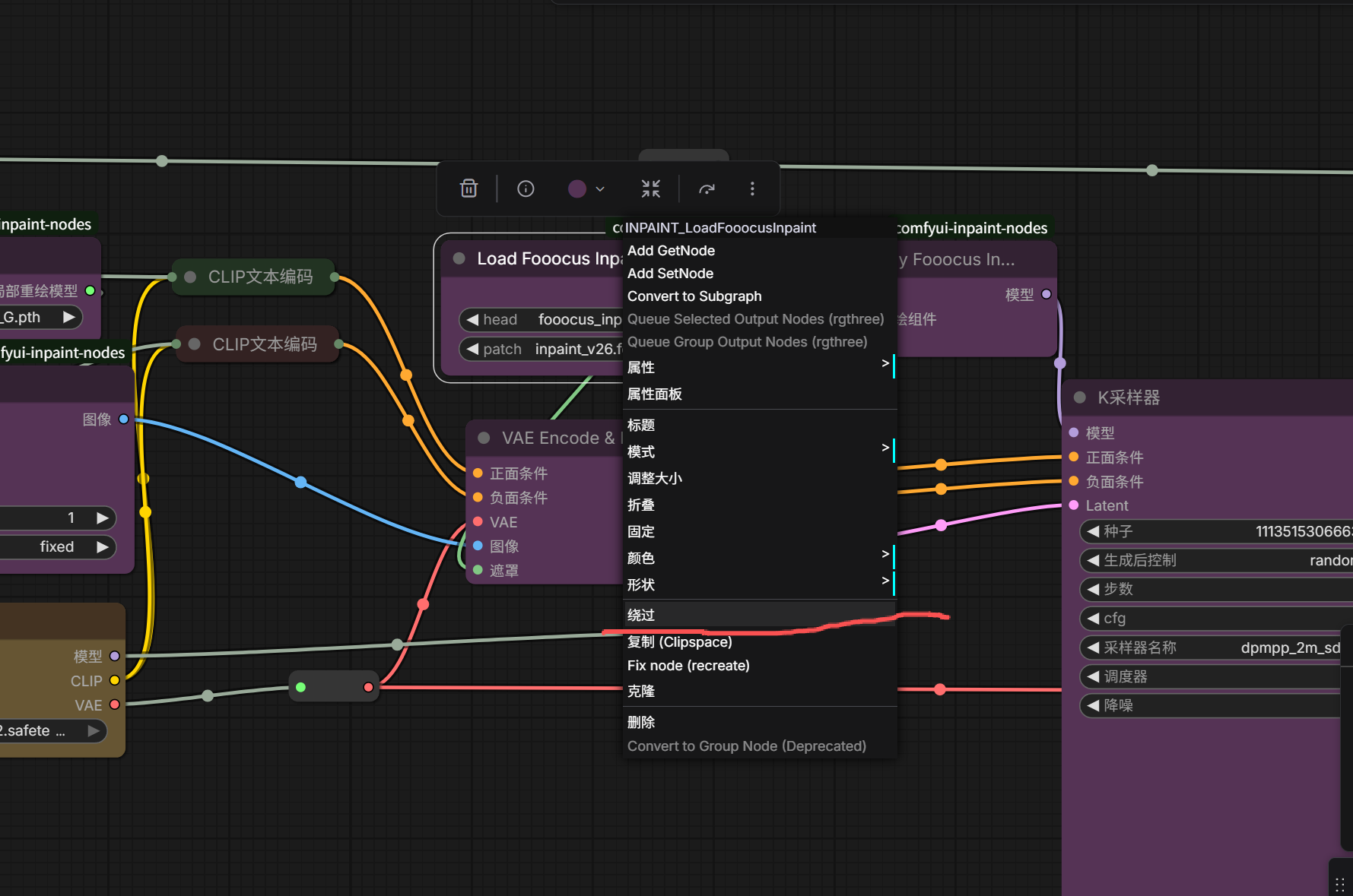 如果你想将不需要的节点隐藏起来,可以鼠标右键点击节点,选择隐藏绕过。