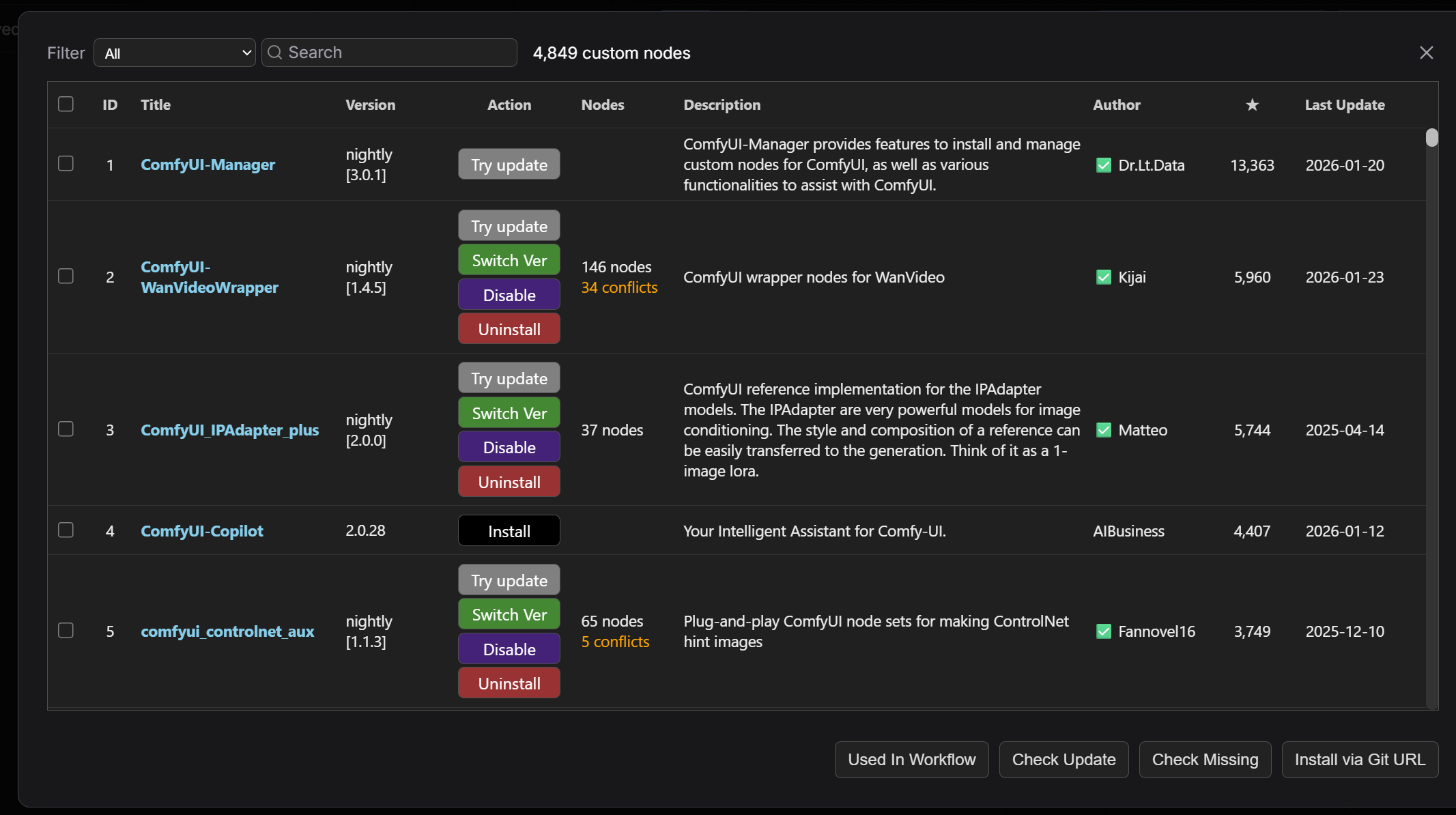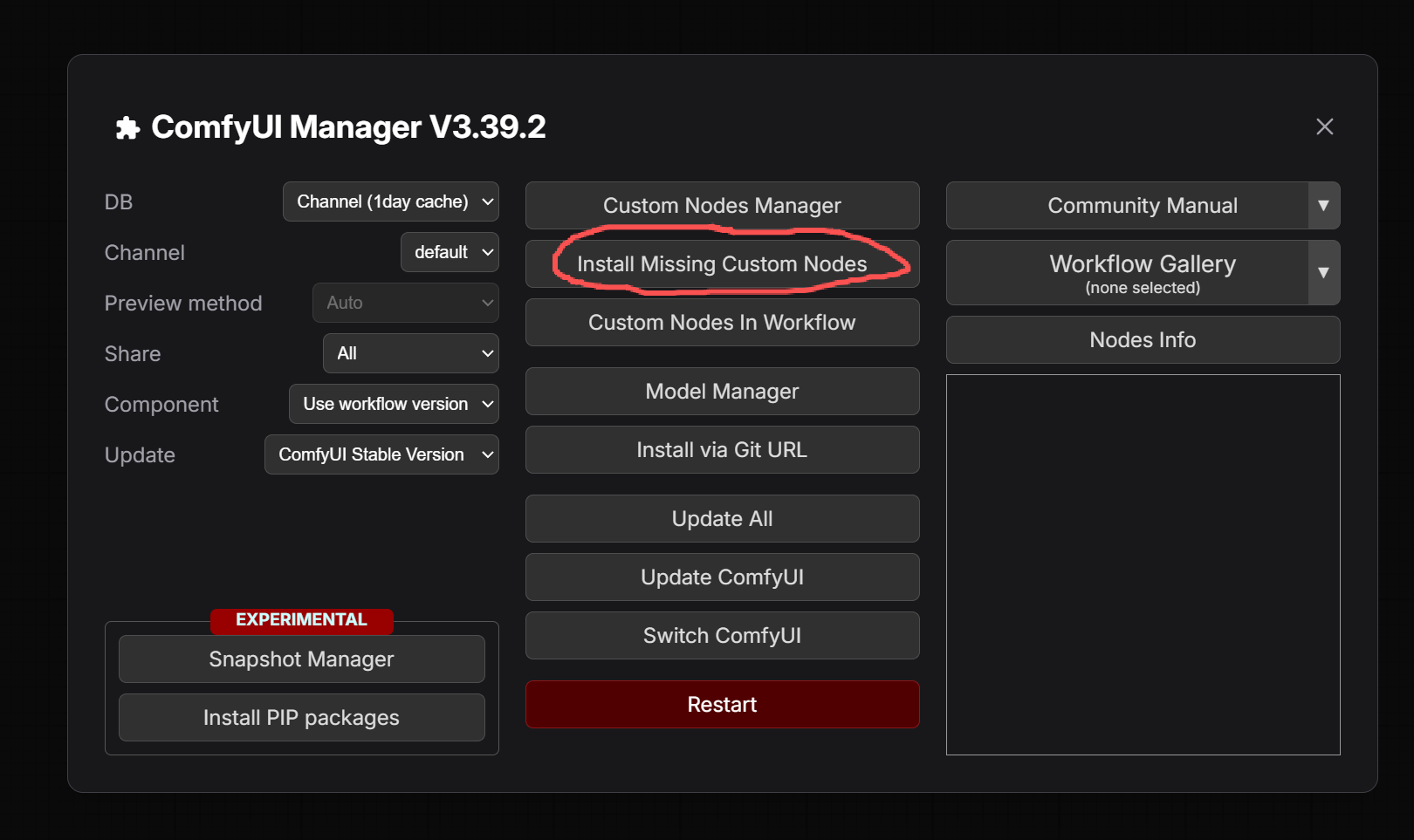 其次,在导入自己找的工作流可能会提示部分插件缺失,可以点击Install Missing Custom Nodes选项,之后安装缺失的插件节点。
