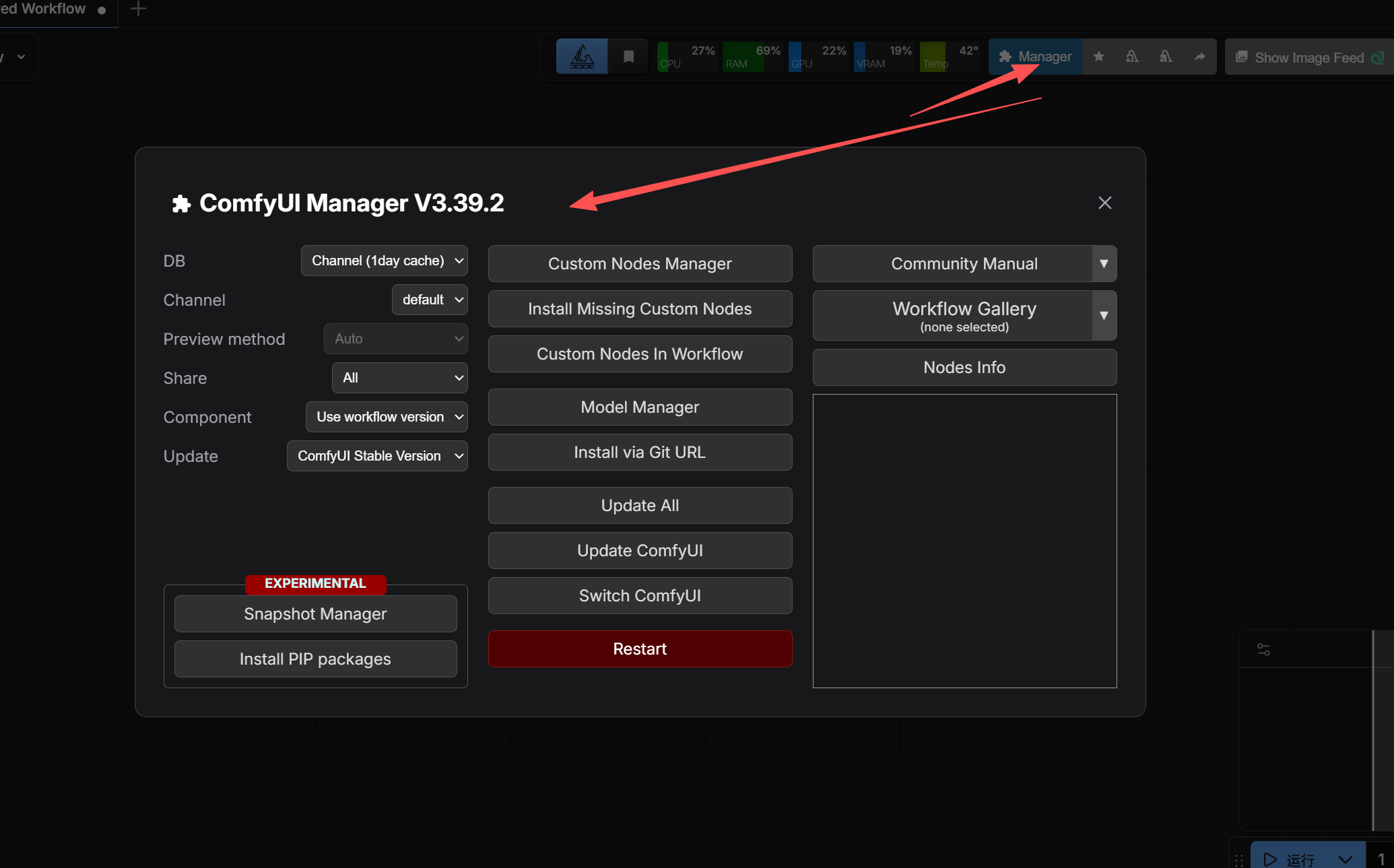点击Custom Nodes Manager选项,然后要安装的插件可以在搜索框里搜索安装。