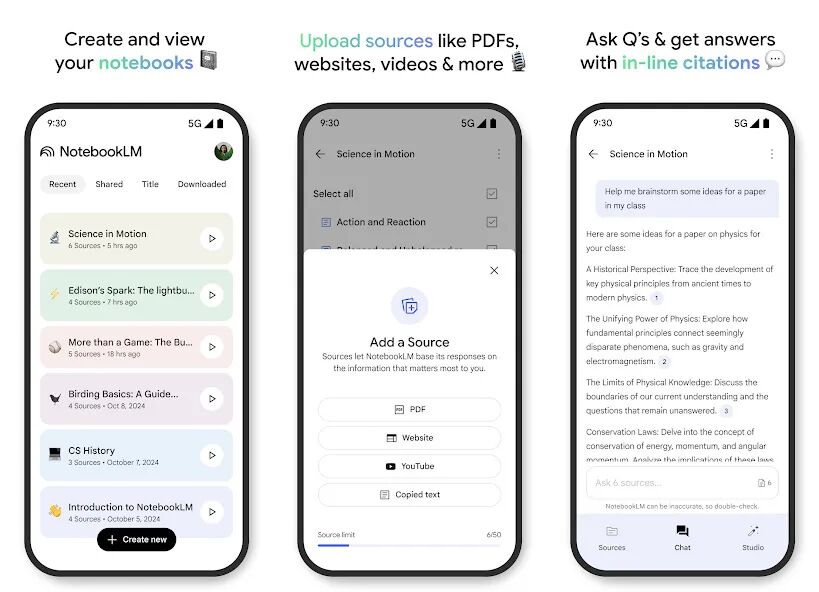 与 ChatGPT 或 Claude 等通用 AI 工具不同,NotebookLM 不会依赖互联网进行检索,它仅在用户上传的资料(如PDF、Word、网页链接,甚至是视频)中寻找答案。