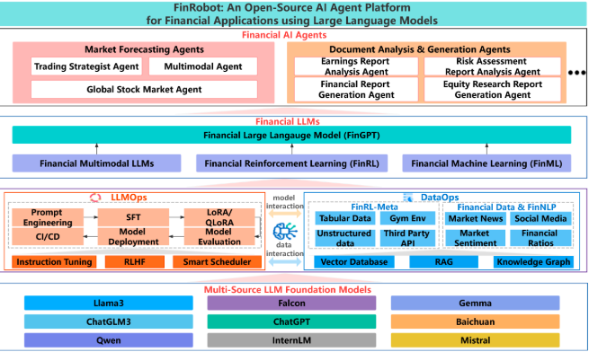 FinRobot 是一个超越 FinGPT 范畴的 AI 代理平台,代表了一个为金融应用精心设计的综合解决方案。它整合了多种 AI 技术,不仅限于语言模型。这个广阔的愿景突显了该平台的多样性和适应性,旨在满足金融行业的多元化需求。