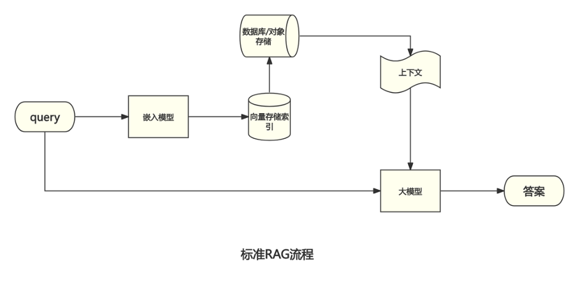 Query → 向量检索 TopK → 拼接上下文 → LLM 生成。