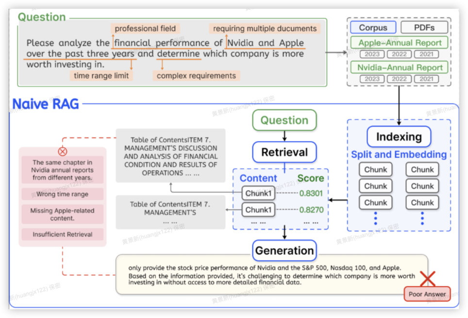 存在检索到很多与 query 无关的片段,增加噪声输入,与 query 关联的信息比较稀疏,需要 LLM 本身去提炼或挖掘利用。仅考虑一个外部知识源,是一次性解决方案,上下文只检索一次,没有对检索到的上下文质量进行推理或验证。