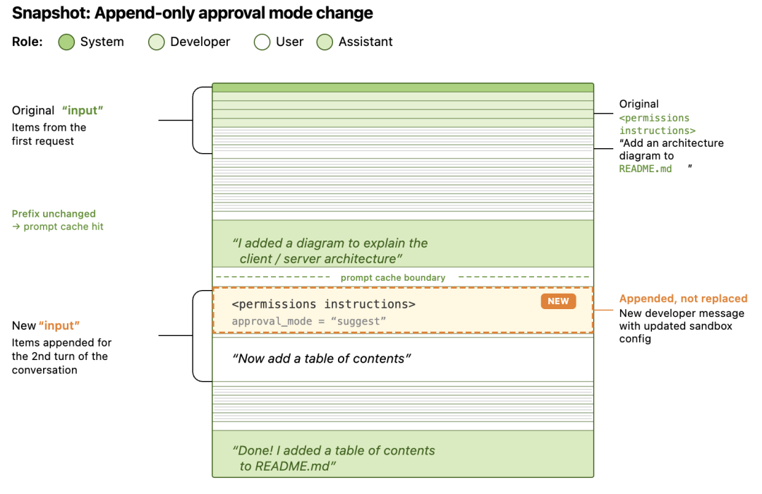 Codex 选择了一种不同的策略:Append-only(只追加,不修改)。当环境状态发生变更时,Codex 保持所有已有消息不变,在历史记录的尾部追加一条新消息来记录变更: