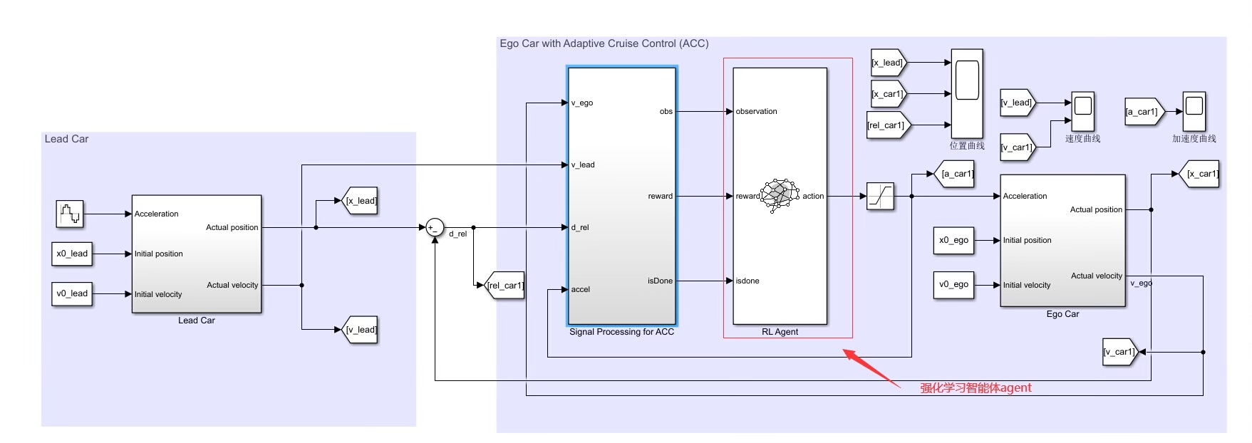 基于强化学习 DDPG 算法实现的acc 自适应巡航控制器设计 配有说明文档 基于simulink 中的强化学习工具箱,设计agent 的奖励函数,动作空间,状态空间,训练终止条件 设置领航车的速度和位移曲线,然后自车的加速度基于 acc 逻辑用ddpg agent 来控制。 模型比较简单,适用于初学强化学习算法的入门资源,可改写成强化学习的车辆队列协同控制。