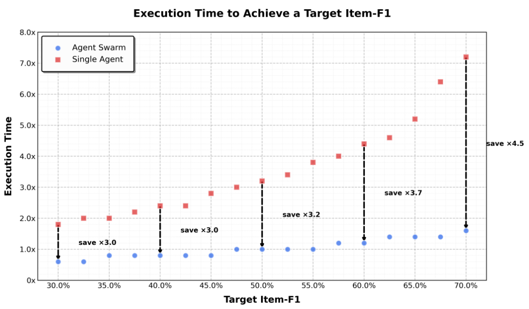 这样一来,在深度调研等任务(WideSearch),Agent Swarm 比单智能体基线快 3 到 4.5 倍,同时准确率还从 72.7% 提升到了 79.0%。
