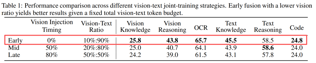 报告里有个实验特别有意思:他们对比了“早期融合”“中期融合”“晚期融合”三种策略,发现早期融合 + 低视觉比例效果最好。也就是说,不是视觉信息越多越好,而是在训练初期就让两种模态慢慢对齐,共同进化。