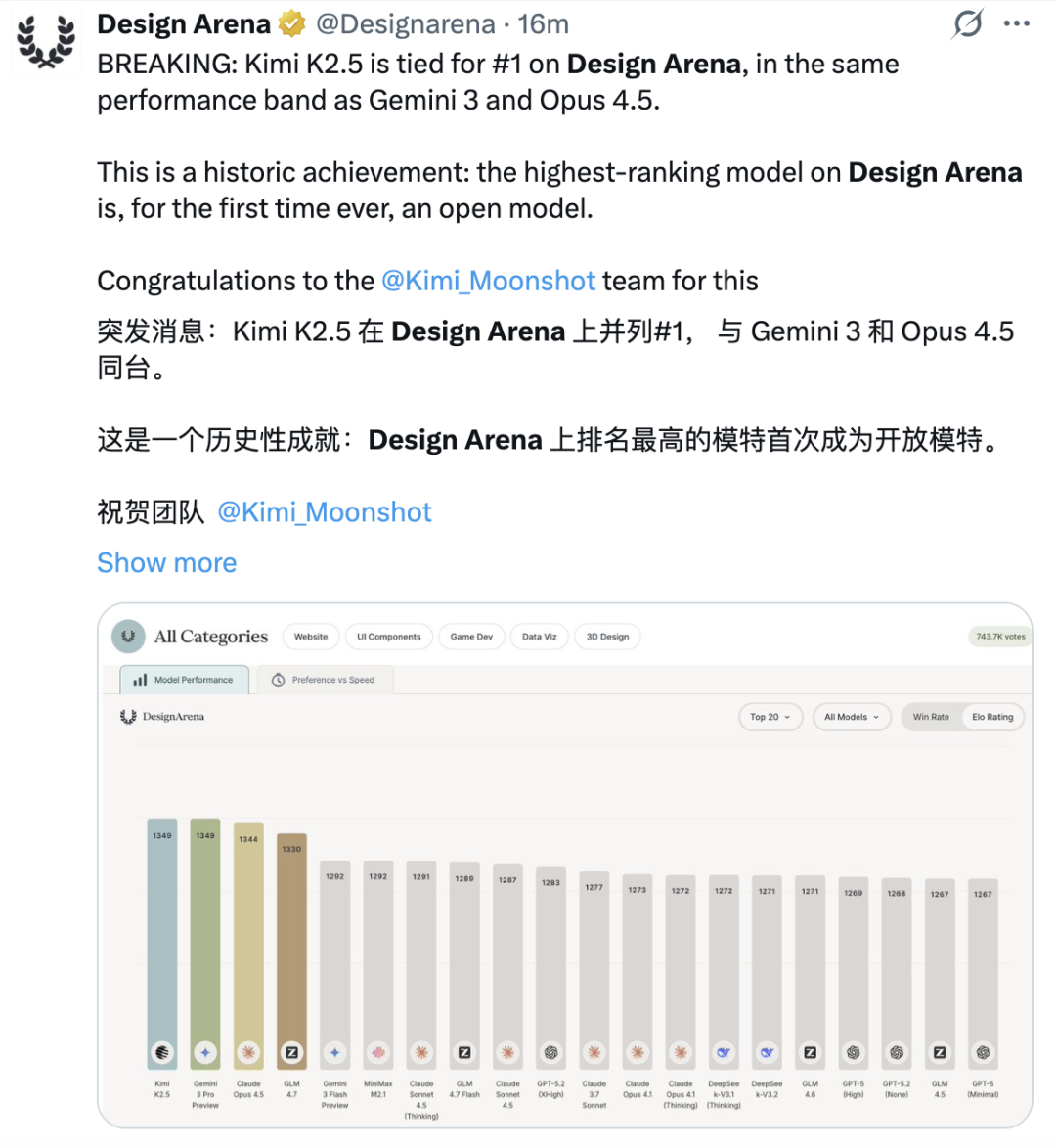这种深度的视觉+文本融合能力,直接反映在了成绩单上:在 Design Arena上,Kimi K2.5 拿下第一,美学与设计本质上是综合的图文理解,而 K2.5 的联合训练,让它具备了这种稀缺的“品味”。