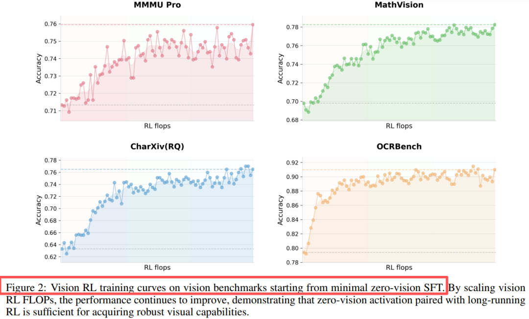 如Figure 2,从zero-vision SFT出发,模型的视觉能力曲线持续稳健上升。像同一个人大脑里的两种本能,实现了深度贯通,仅凭一句语言指令,它就能自动激活相应的视觉能力来执行任务,而无需再依赖昂贵的“手把手”视觉示范数据。