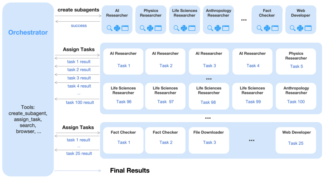 这套系统里有一个“指挥家”(Orchestrator),负责动态拆分任务、创建子智能体、分配工作,子智能体可以同时执行不同任务,最后再把结果汇总。那么,让它学会在恰当时机进行高效的任务拆分与调度呢?