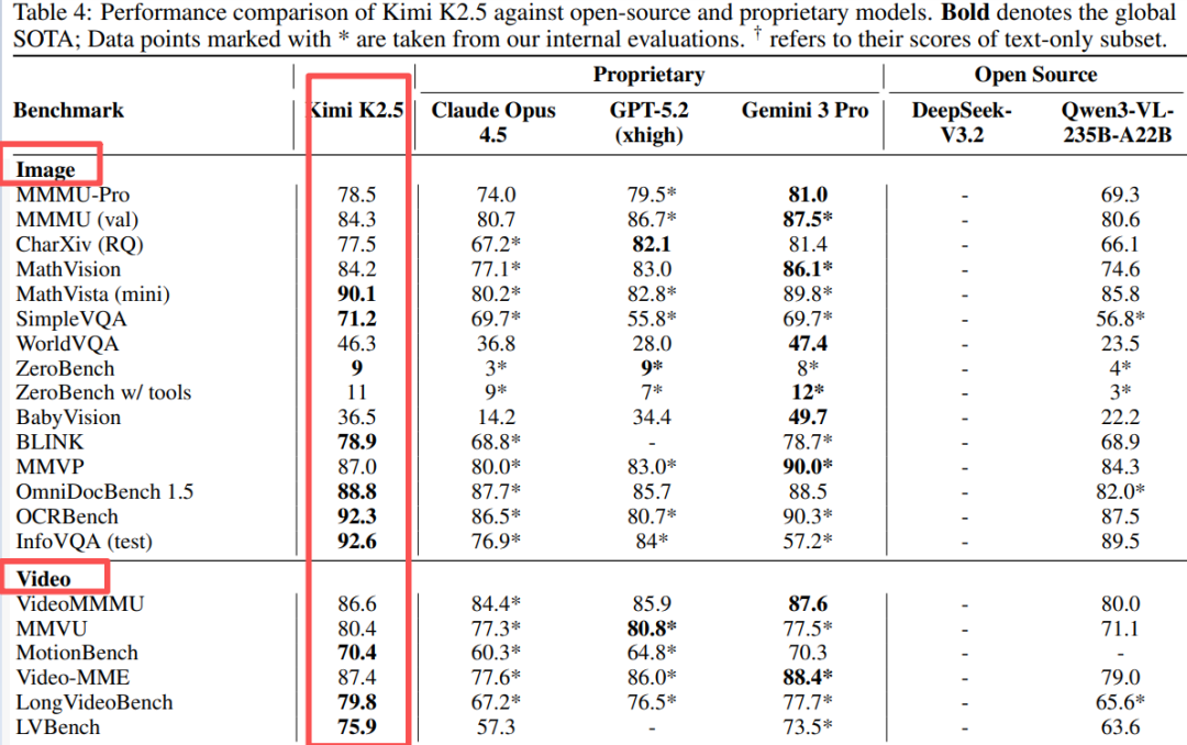 Table 4: Kimi K2.5实现了强劲的图片&视频理解性能