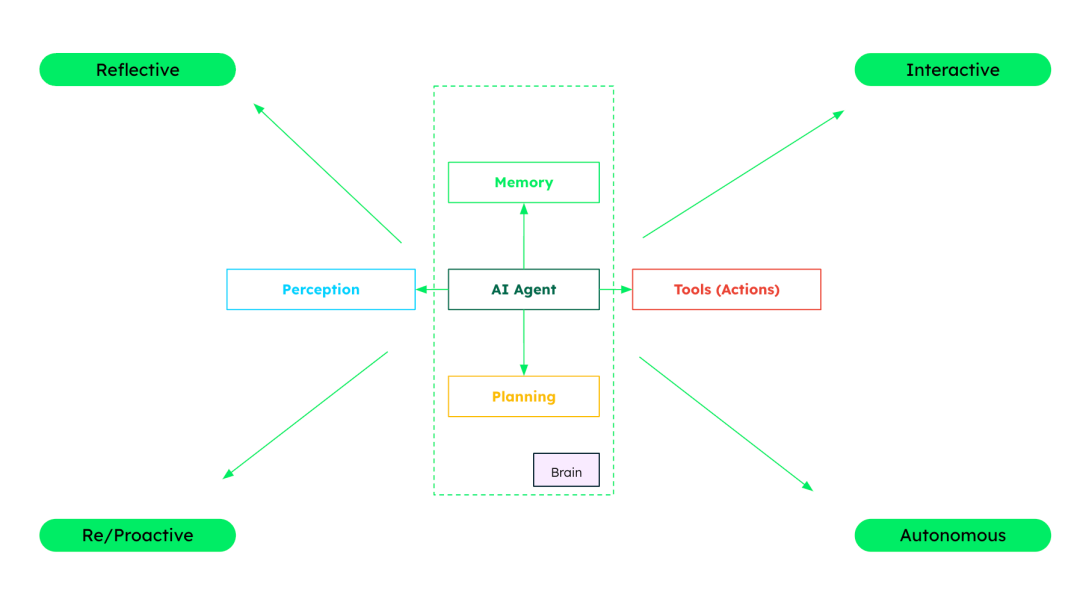 - AI Agent 具有自主性和反应性:自主特性使其能够基于内部处理结果和外部观察执行行动,通常无需明确的外部指令。反应性由两个关键能力提供支持:工具使用和输入处理。这些能力使 AI Agent 能够动态响应环境或任务条件的变化,并相应调整其行为和行动。