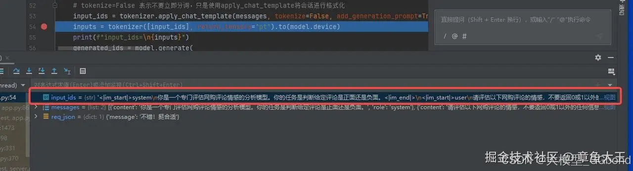 # 使用tokenizer将整个会话转换成模型可以理解的input_ids,并将这些input_ids输入到模型