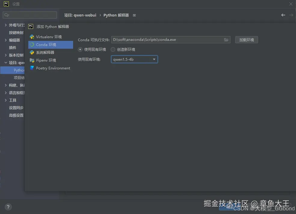 在我们新建完名为qianwen的conda虚拟环境后,去pycharm的setting->Python Interpreter中导入创建好的conda环境即可: