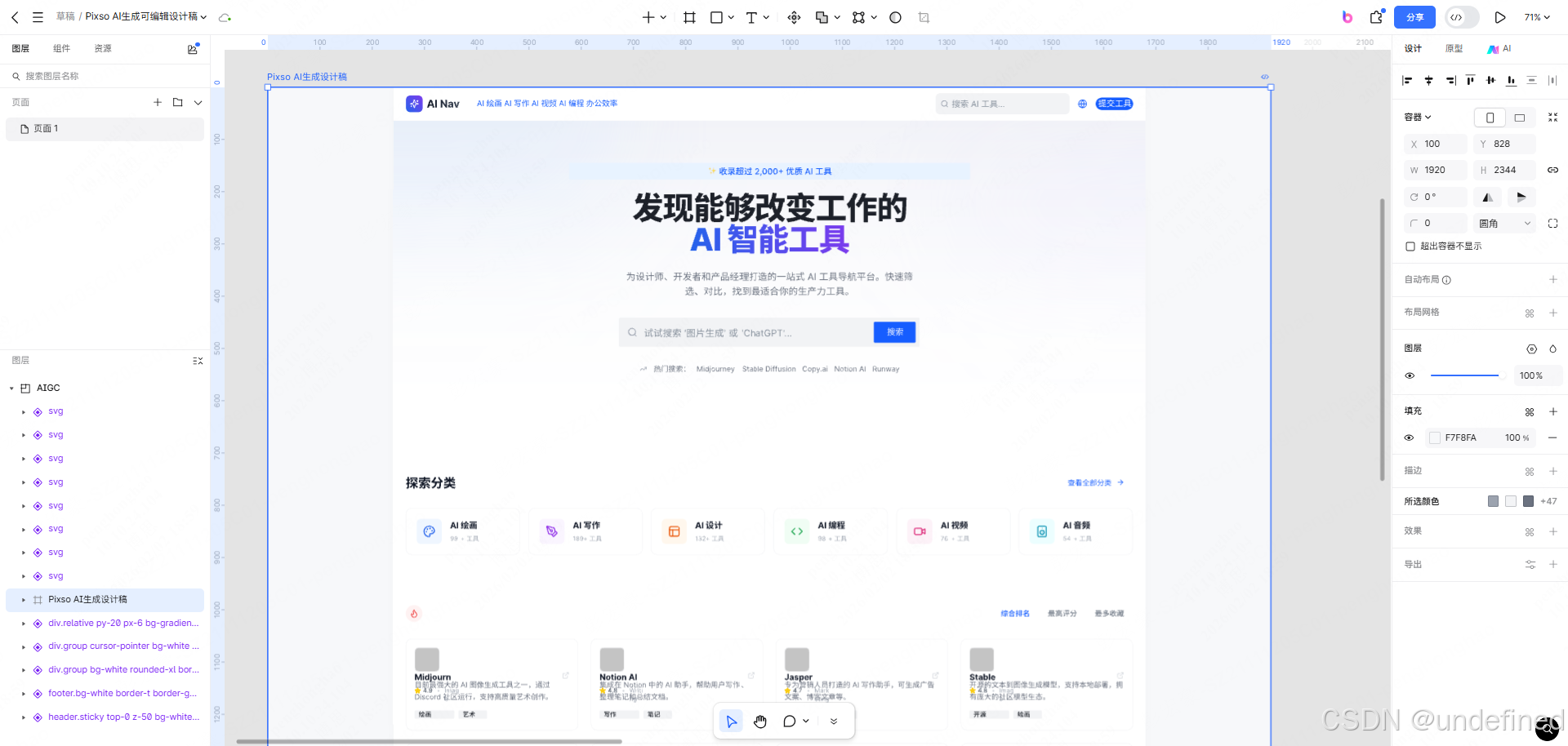 结构化生成:它生成的不是静态图,而是包含画板、组、文本和形状的完整矢量图层树。
