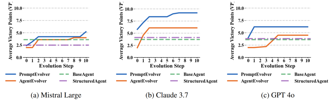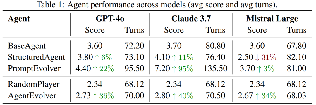 「压倒性的性能优势」:在所有参与测试的大模型(包括GPT-4o、Claude 3.7等)中,凡是具备自进化能力的智能体,其表现都远超静态的基线系统。其中,由Claude 3.7驱动的“提示词进化智能体”(PromptEvolver)表现最为惊人,平均得分暴涨了95%!这表明了自我进化机制能够有效解锁并释放AI的深层潜力。