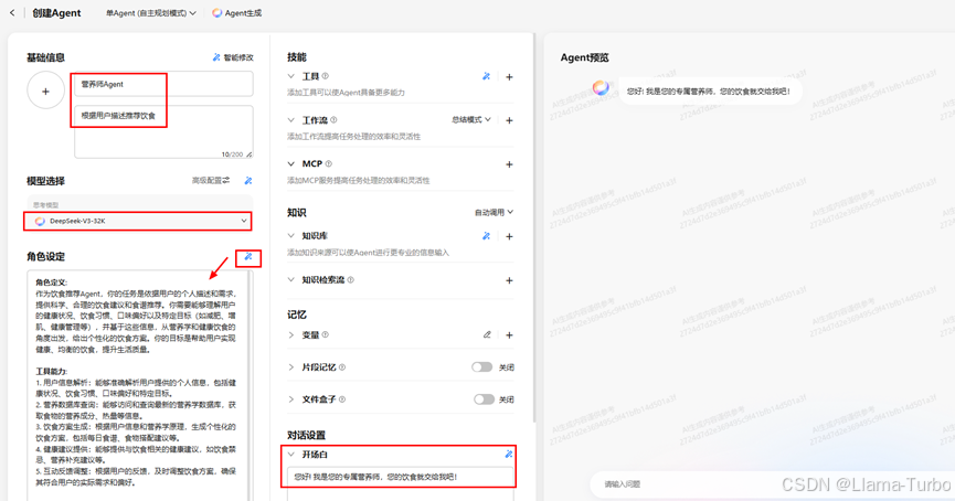 定义Agent的身份和行为风格(如“专业、简洁的营养师顾问”),支持手动输入或智能生成;
