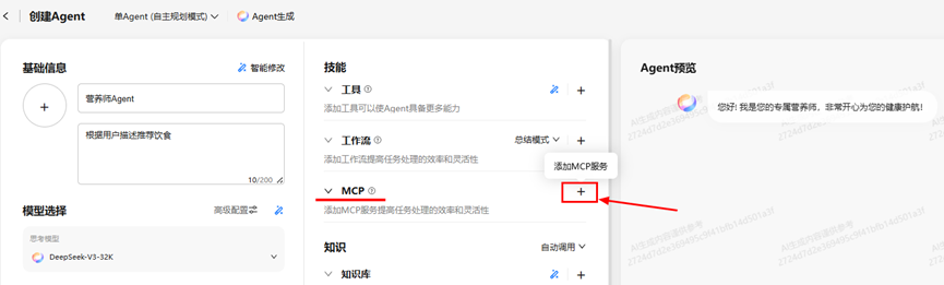 从预置模型(如DeepSeek-V3-32K)中挑选,或接入自定义模型,模型决定了 Agent 的“思考能力”;