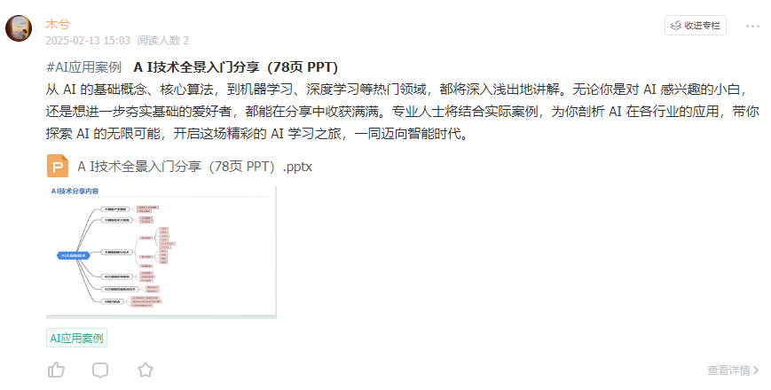 从 AI 的基础概念、核心算法,到机器学习、深度学习等热门领域,都将深入浅出地讲解。无论你是对 AI 感兴趣的小白,还是想进一步夯实基础的爱好者,都能在分享中收获满满。
